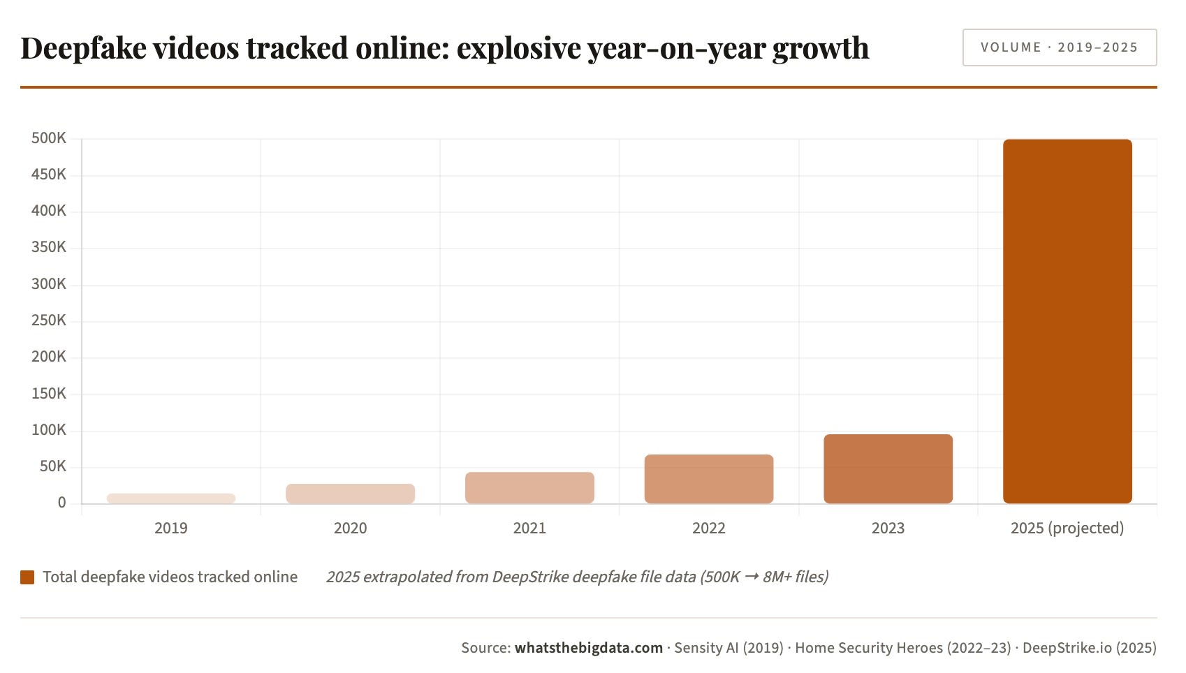 The growth has only accelerated since. DeepStrike.io projects deepfake files surged from 500,000 in 2023 to 8 million by 2025 — a 1,500% increase in two years.