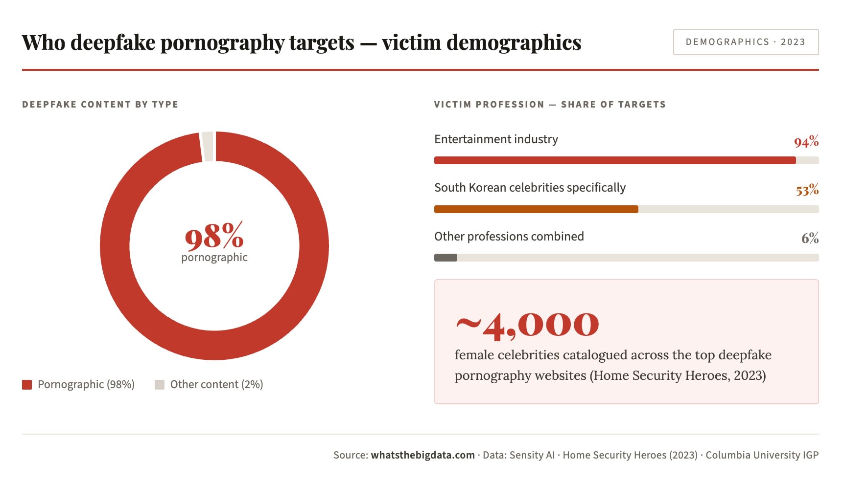 The overwhelming majority of this content targets women. Sensity AI’s foundational research found 100% of early deepfake pornography subjects were female; the 2023 data puts it at 99%. South Korean singers and actresses constitute 53% of individuals featured, and 94% of all targets work in entertainment.