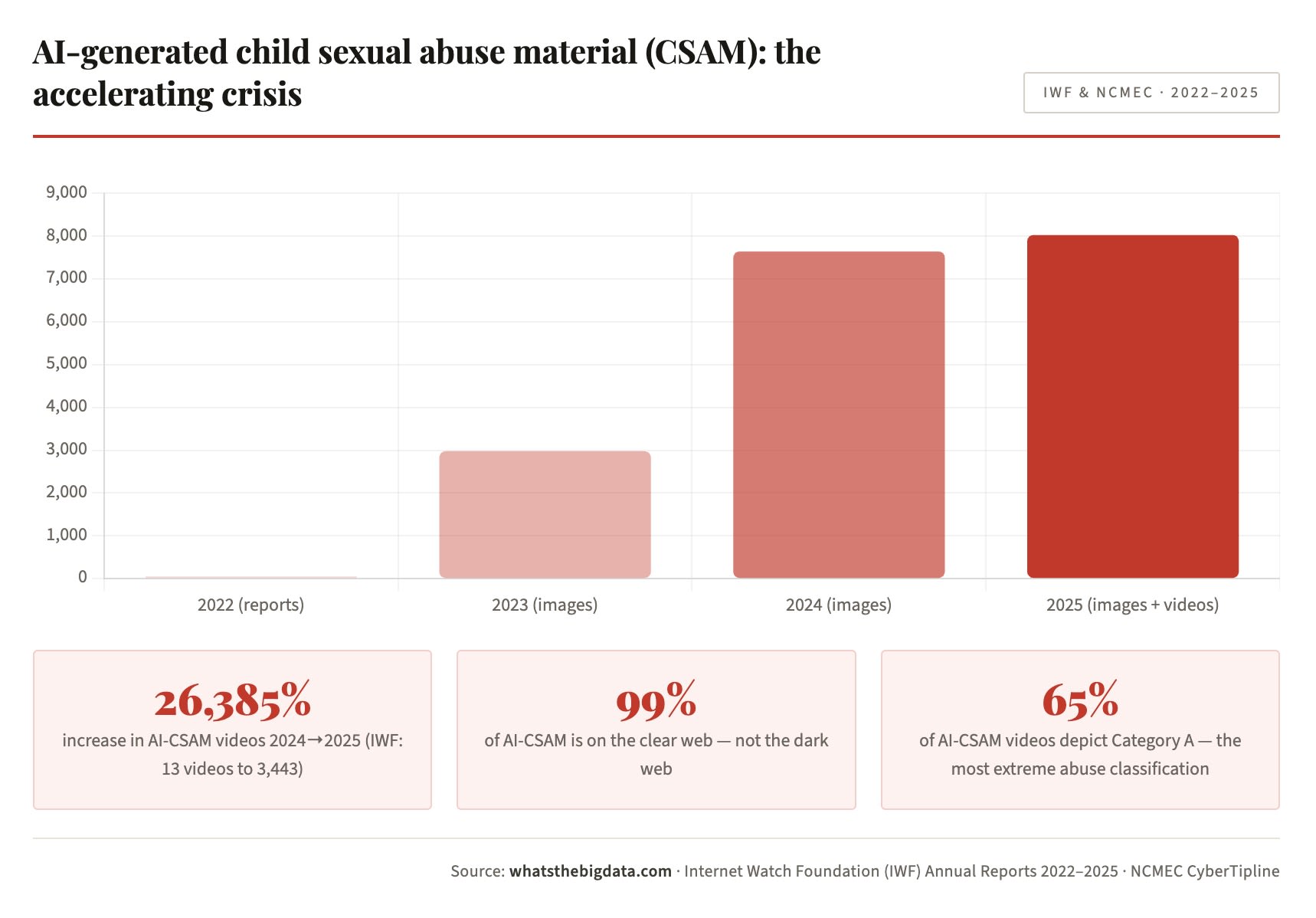 By 2024, actionable reports containing AI-generated CSAM rose 380% to 245 reports covering 7,644 images. The 2025 figures were far worse: 8,029 AI-generated images and videos assessed as showing realistic child abuse, including 3,443 AI-generated videos — a 26,385% increase from 2024’s 13 videos.