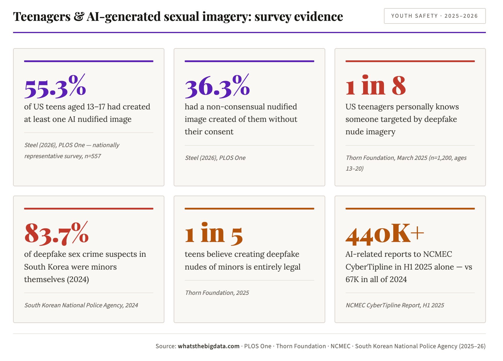 - Steel (2026, PLOS One): Nationally representative survey finding 55.3% of U.S. adolescents aged 13–17 had created nudified images.