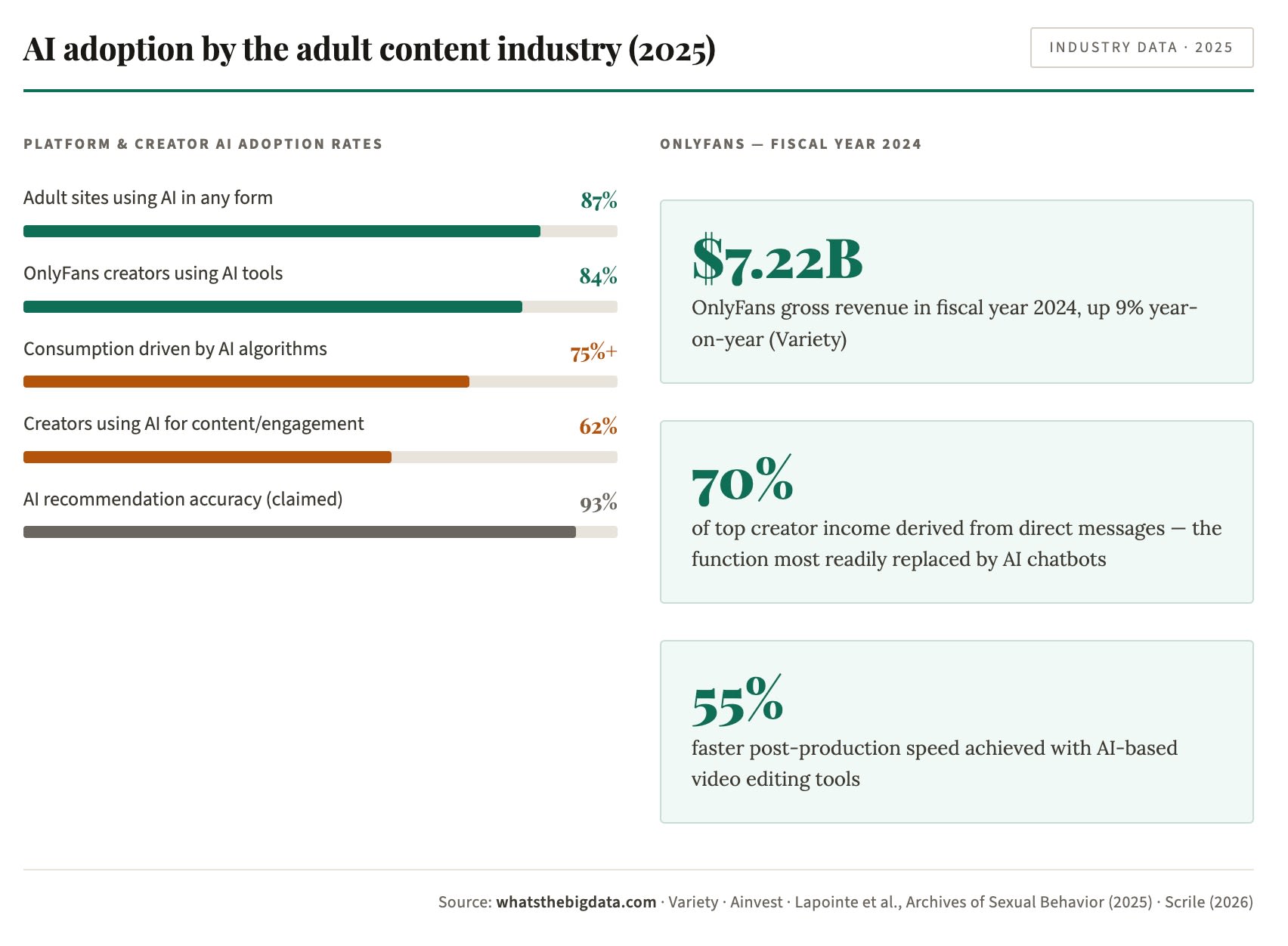 OnlyFans, the dominant creator platform, processed $7.22 billion in gross revenue in fiscal year 2024, paying out $5.8 billion to creators. While not exclusively an AI-powered platform, 84% of its creators now use AI tools in some capacity — from AI chatbots handling fan messages to content optimization — and direct messages, the area most ripe for AI automation, generate 70% of income for top creators.